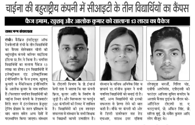 Campus selection of three students of Cambridge Institute of Technology Ranchi has been done by Chinese multinational company Carivar Media India Pvt. The annual package of selected students will be of 13 lakhs. Among these students Faiz Imam of Electrical and Electronics Engineering, Khushboo Kumari and Prof. TNP Department of Mechanical Engineering.
