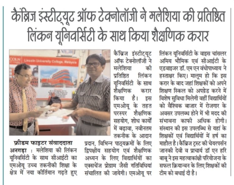 CIT's MoU with Lincoln University of Malaysia Creating a new record in the field of higher technical education, Cambridge Institute of Technology has entered into an academic agreement with the prestigious Lincoln University of Malaysia. Activities such as mutual academic cooperation, promotion of research vehicles, exchange of latest technology, bilateral cooperation for various courses and exchange programs of students for academic studies under this MoU Will be operated.