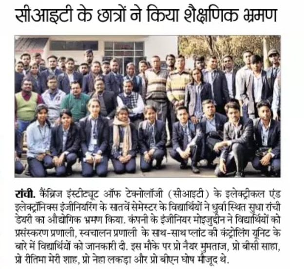 Students of the seventh semester of Electrical and Electronics Engineering of Cambridge Institute of Technology (CIT) took an industrial visit to Sudha Ranchi Dairy located in Dhurva. The company's engineer Moizuddin briefed the students about the processing system, automation system as well as the controlling unit of the plant. Prof. Mumtaz, Prof. BC Saha, Prof. Ritima Mary Shah, Prof. Neha Lakra and Prof. BN Ghosh were present on this occasion.