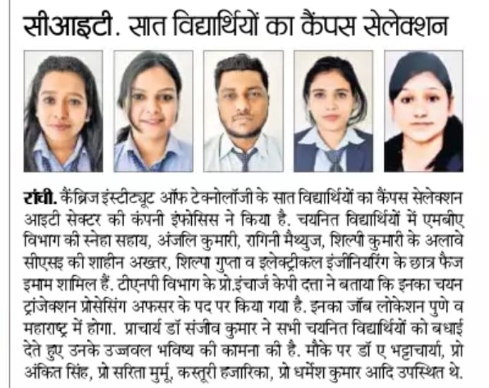 The campus selection of seven students of Cambridge Institute of Technology has been done by IT sector company Infosys. The selected students include Sneha Sahay, Anjali Kumari, Ragini Mathews, Shilpi Kumari of MBA department, Shaheen Akhtar, Shilpa Gupta of CSE and Faiz Imam, a student of electrical engineering. KP Dutta, Prof. Incharge of TNP Department told that he has been selected for the post of Transaction Processing Officer.